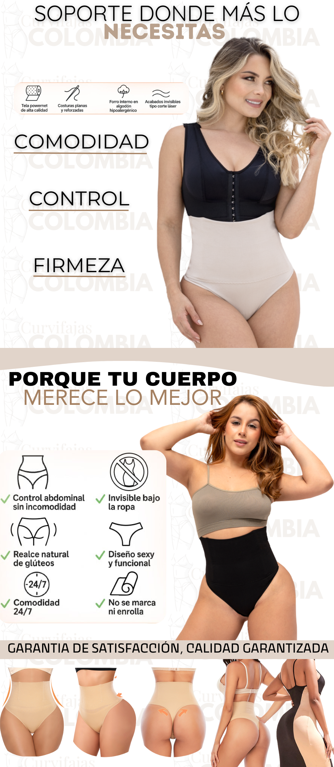 Confeccionado con costuras planas y refuerzos estratégicos, se mantiene en su lugar sin enrollarse ni marcarse bajo la ropa. Además, está disponible en colores beige y negro, perfectos para adaptarse a diferentes estilos y ocasiones, ya sea uso diario, postparto o postquirúrgico.